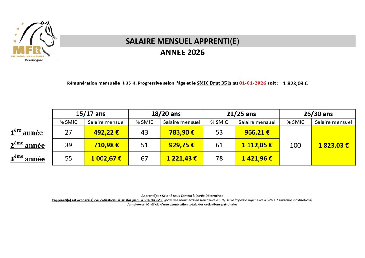 Rémunération mensuelle à 35H. Progressive selon l'âge et le SMIC Brut 35 h: